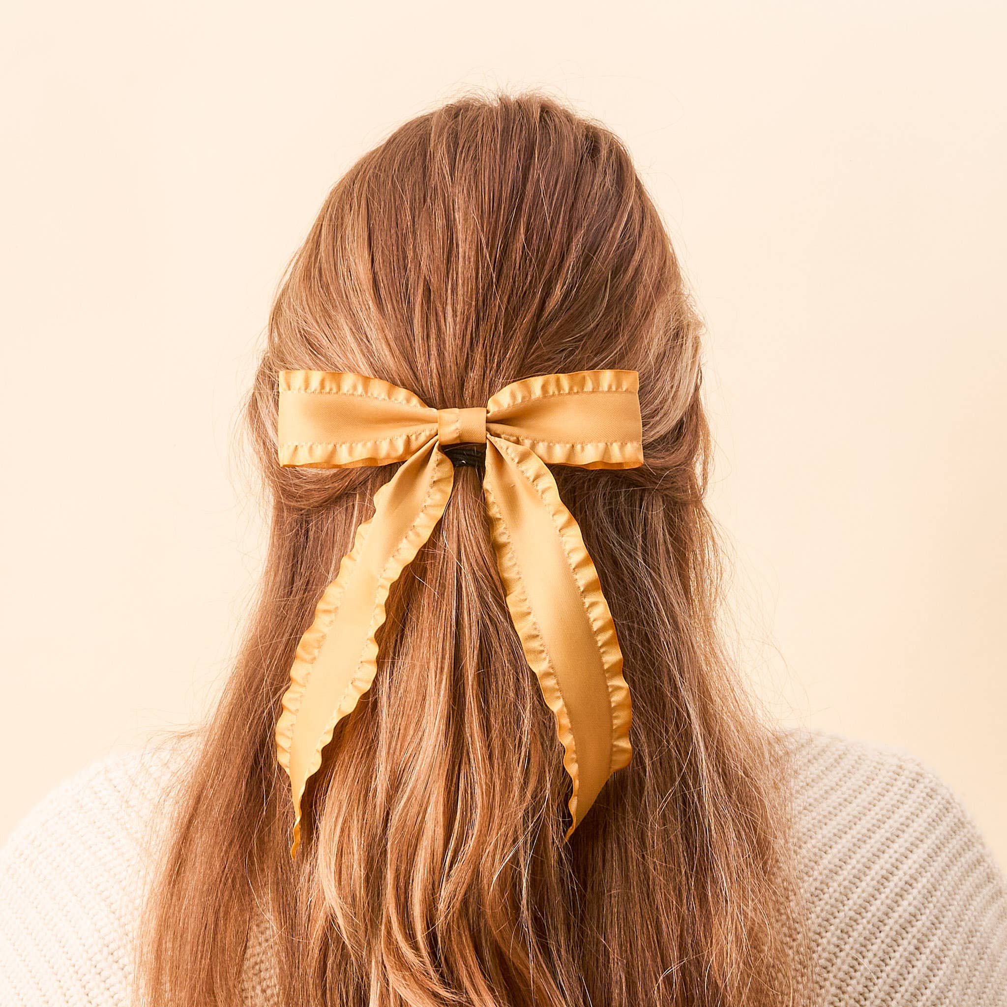 Add a touch of elegance to any outfit! Crafted with exquisite attention to detail, these bows feature delicate ruffles that bring a playful and sophisticated flair to your hairdo. Available in a range of colors to match any occasion, from casual outings to special events. Easy and comfortable fit, secure hold For all hair types and lengths Gold barrette clip closure Dimensions: 8”L x 6”W X 0.5”H