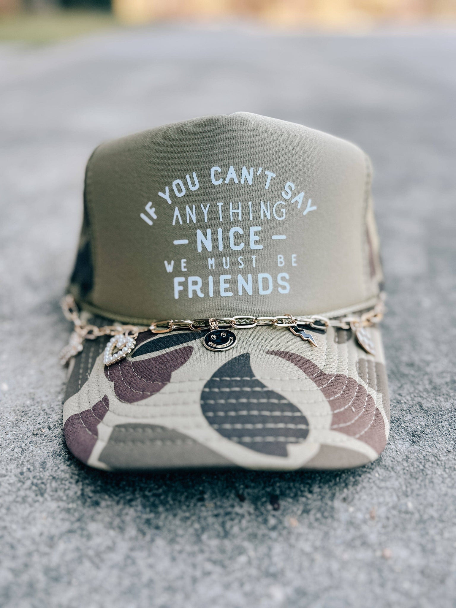 Two-Toned Camo Foam Trucker Hat – "If You Can’t Say Anything Nice, We Must Be Friends" For the ones who speak fluent sarcasm and loyalty—this one’s for you. This two-toned camo foam trucker hat features the popular and unapologetic graphic: "If You Can’t Say Anything Nice, We Must Be Friends." With a classic mesh back for breathability and an adjustable snapback for the perfect fit, it’s made for long days and louder personalities. This cap is your new favorite sidekick for bad decisions and good company.