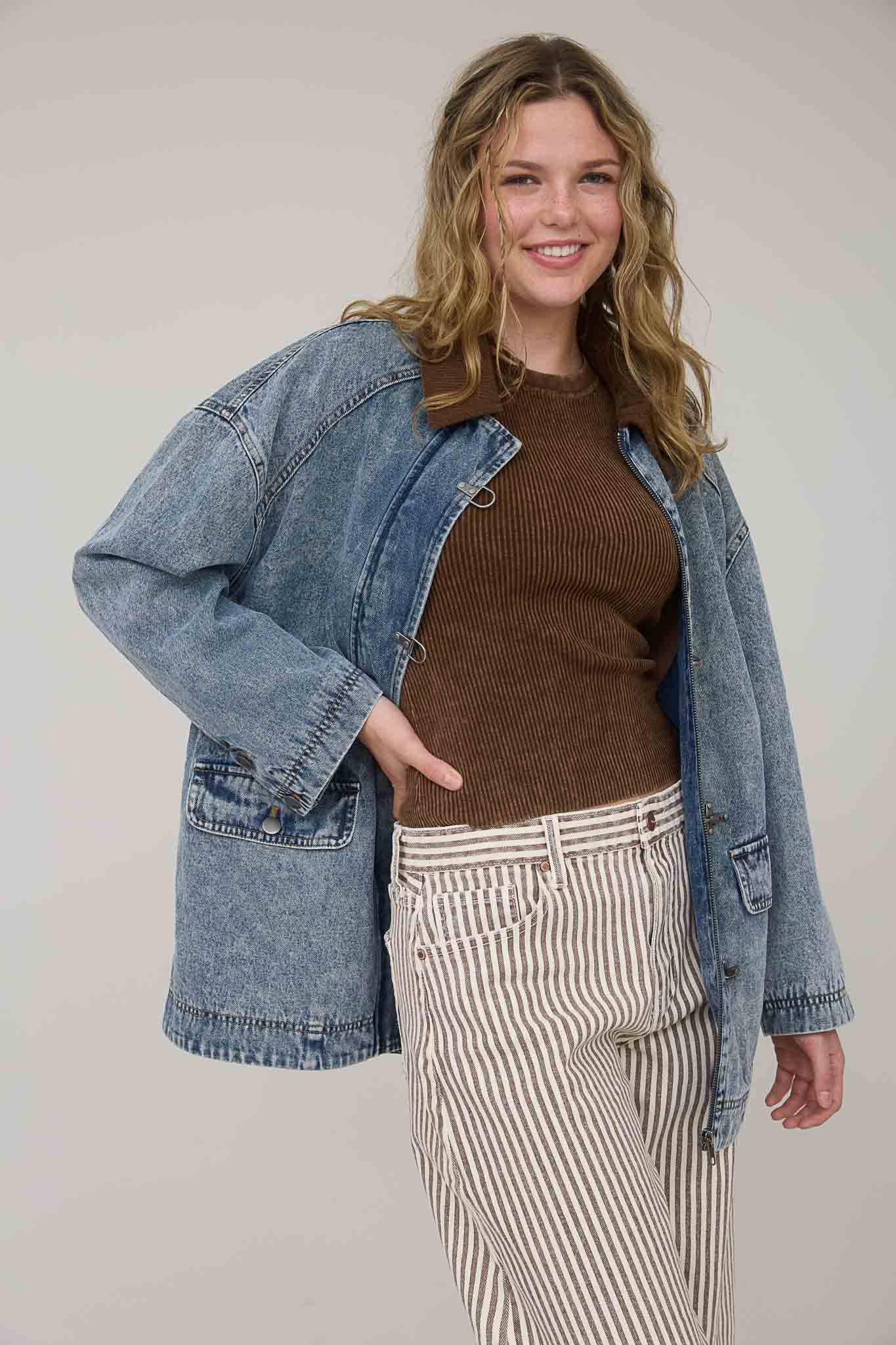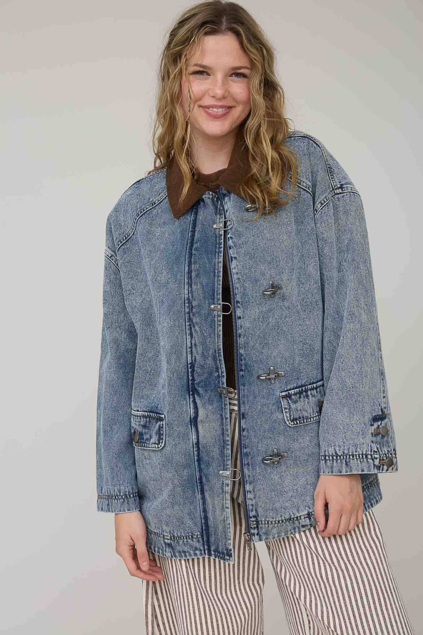 COLLARED FRONT LATCH HOOK HARDWARE DETAIL LONG SLEEVES POCKET DETAIL LONG LINE LINED WASHED DENIM PATTERN CORDUROY JACKET DENIM JACKET DENIM COAT OUTERWEAR SHELL:100%COTTON LINING:100%POLYESTER CONTRAST:100%POLYESTER