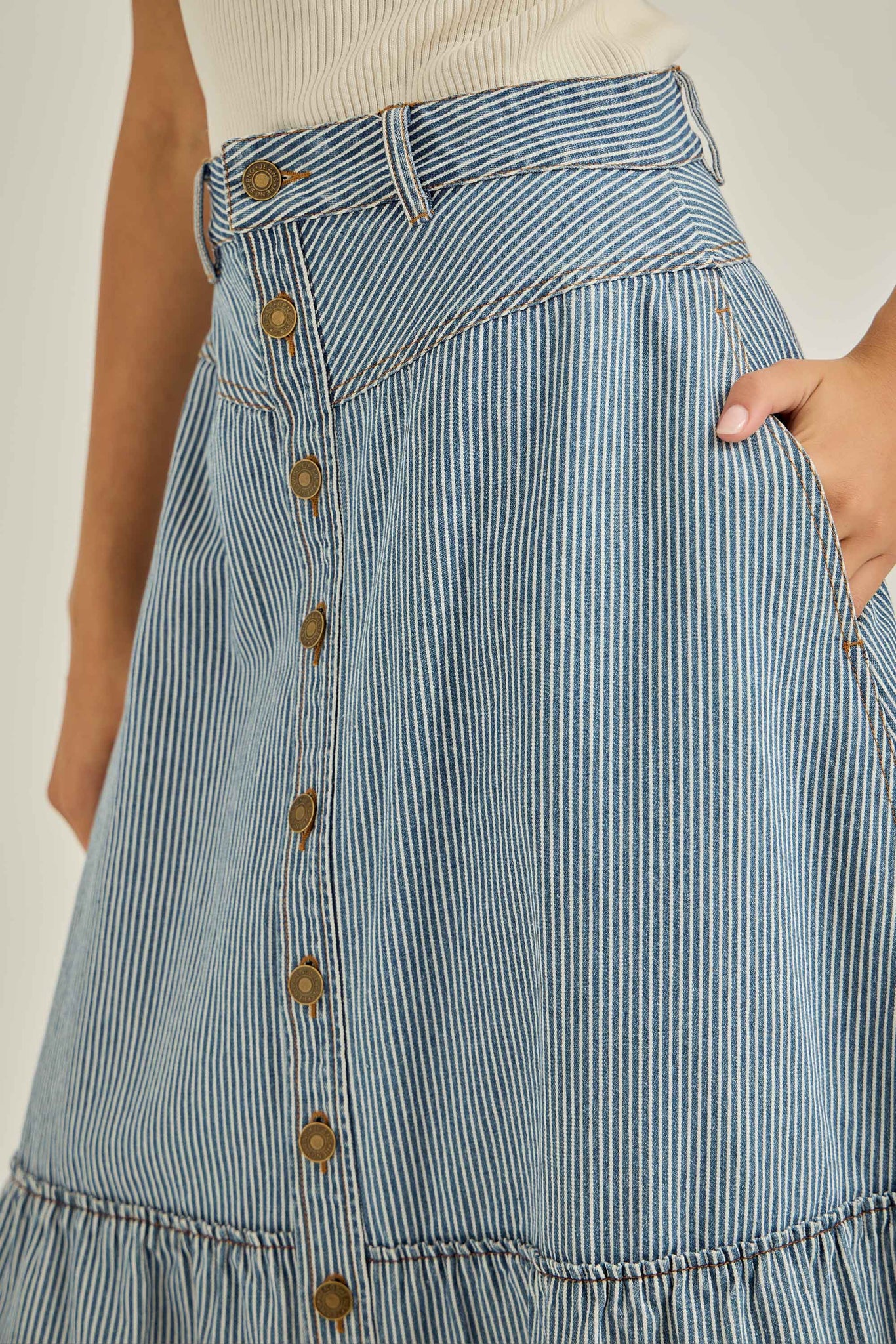 - Denim pin stripe - Functional buttoned closure - Side pockets - Mid-rise - Tiered hemline