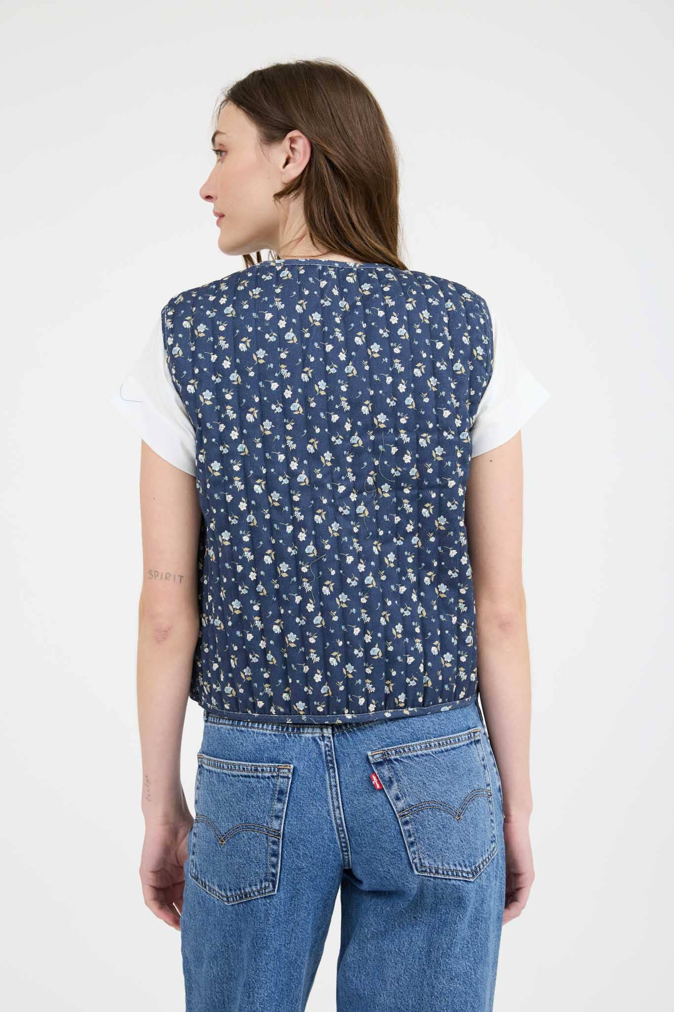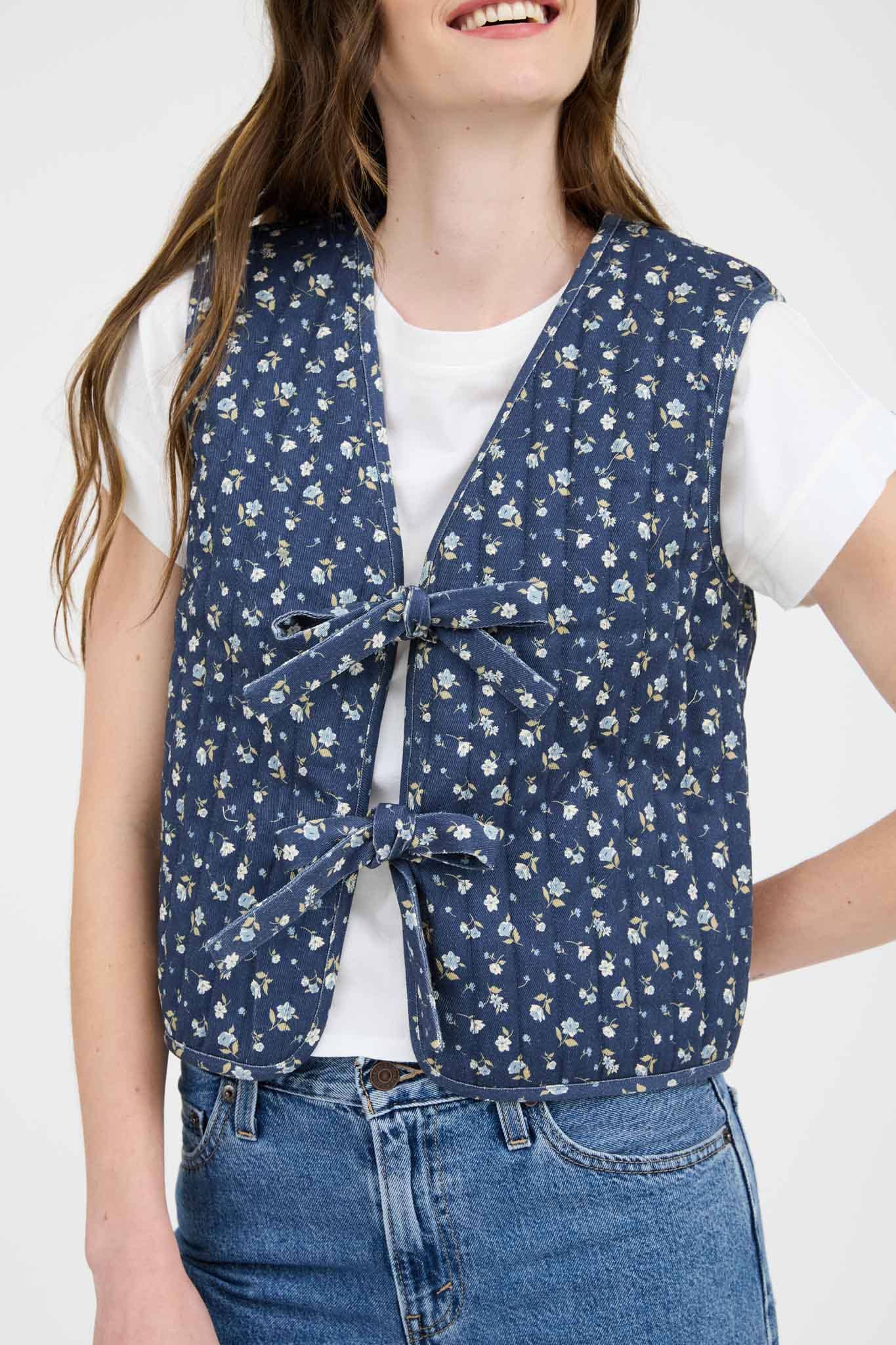 V NECKLINE SLEEVELESS DOUBLE FRONT TIE QUILTED VEST FLORAL PATTERN LINED SHELL:96%COTTON 4%SPANDEX LINING:95%POLYESTER 5%SPANDEX FILLING: 100%POLYESTER