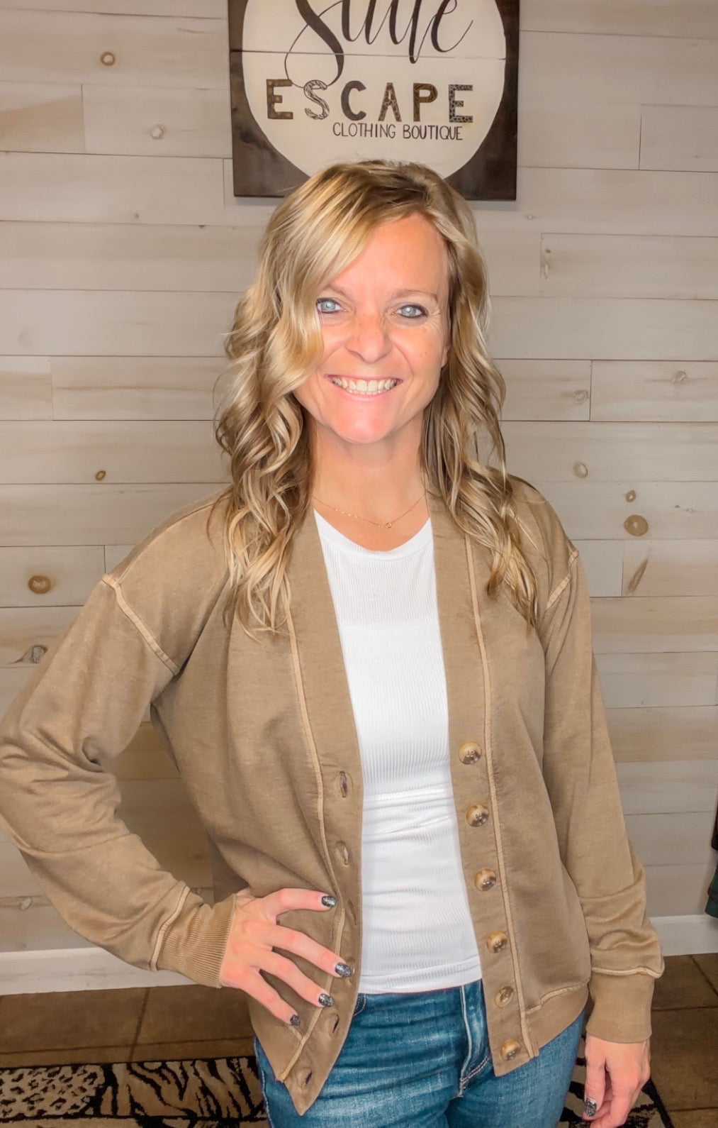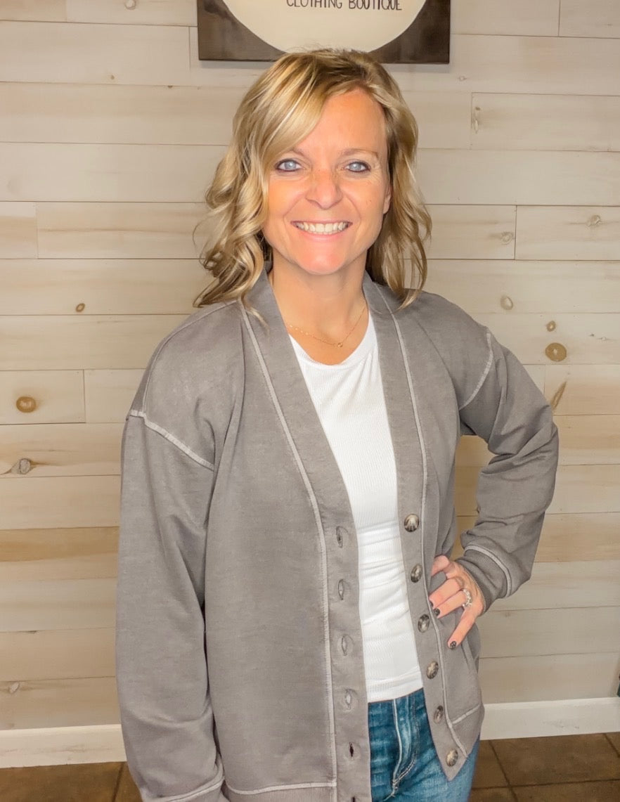 V NECKLINE LONG SLEEVES WASHED DETAIL TRIM KNIT CARDIGAN SWEATER SELF:60%COTTON 40%POLYESTER CONTRAST:97%COTTON 3%SPANDEX